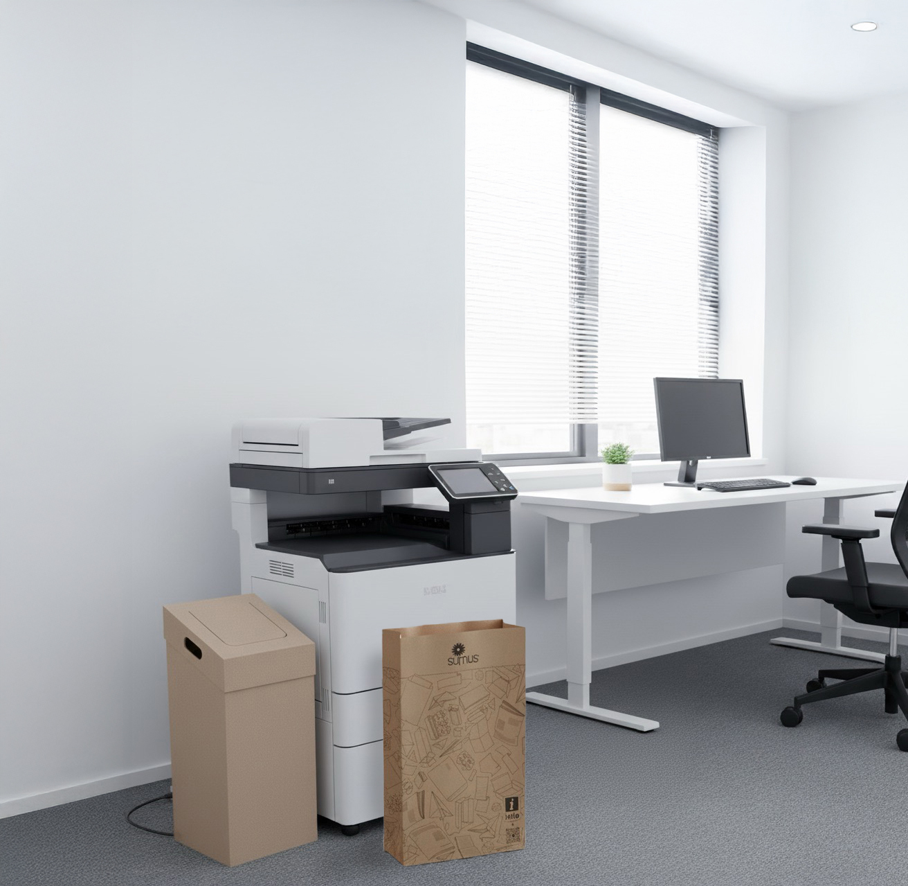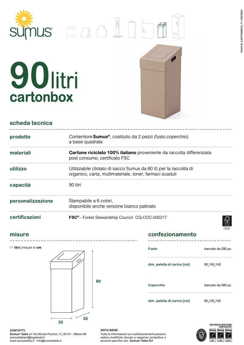 Contenitore Sumus®, costituito da 2 pezzi (fusto,coperchio) a base quadrata. Cartone riciclato 100% italiano proveniente da raccolta differenziata post consumo, certificato FSC®. Utilizzabile (dotato di sacco Sumus da 60 lt) per la raccolta di organico, carta, multimateriale, toner, farmaci scaduti.