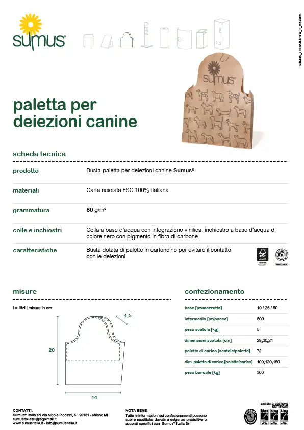 Ecopaletta per deiezioni canine Sumus®, in carta riciclata italiana FSC® 100% Italiana da 80 g/m². Colla a base d’acqua con integrazione vinilica, inchiostro a base d’acqua di colore nero con pigmento in fibra di carbone.
