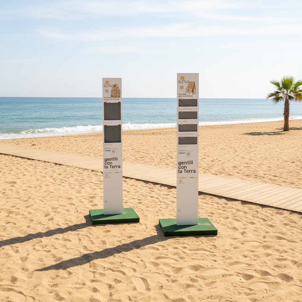 Colonnina espositore in plastica riciclata per il decoro urbano (da scarto pulper di cartiera) per sacchetti Sumus® in carta riciclata.